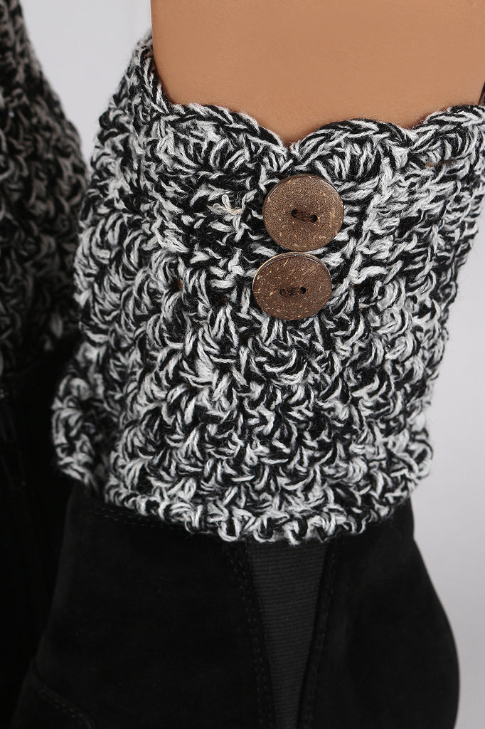 These leg warmers feature a thick marl knit in contrasting patterns and double wood button embellishments. Shoes not included. 100% Acrylic.