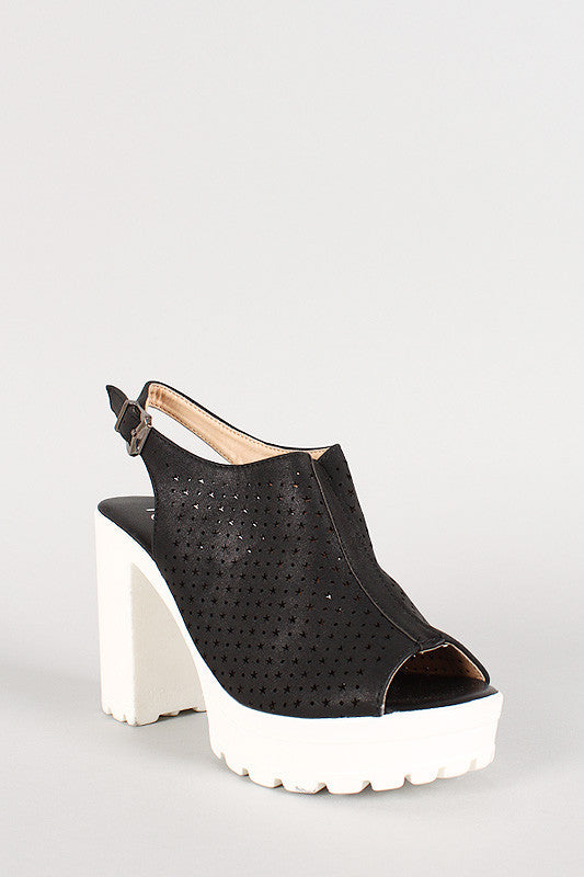 Perforated Leatherette Stars And Circles Slingback Lug Sole Heel