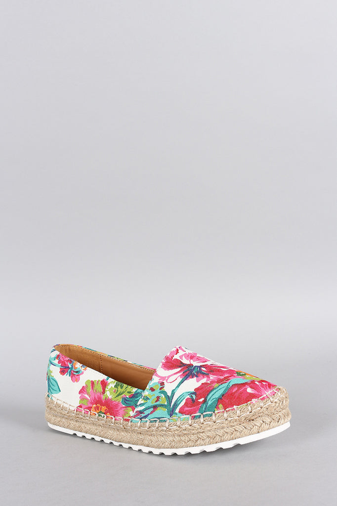 This floral print fabric upper, and braided espadrille midsole. Finished with lightly padded insole and easy slip on style.