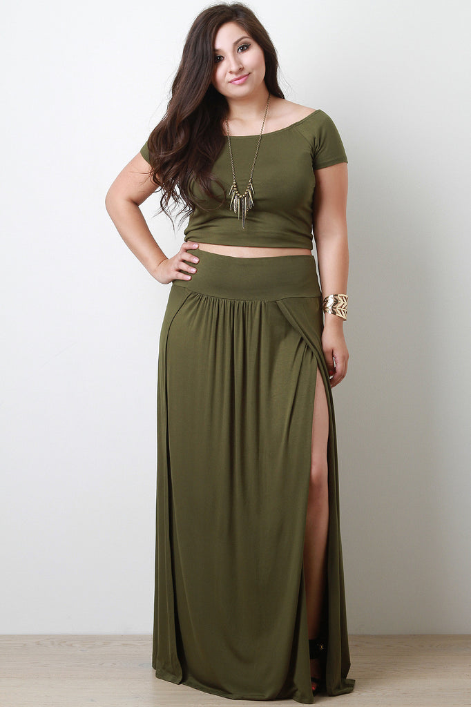This top is crop top construction with a scoop neckline and off shoulder sleeves. Accessories sold separately. 96% Rayon. 4% Spandex.