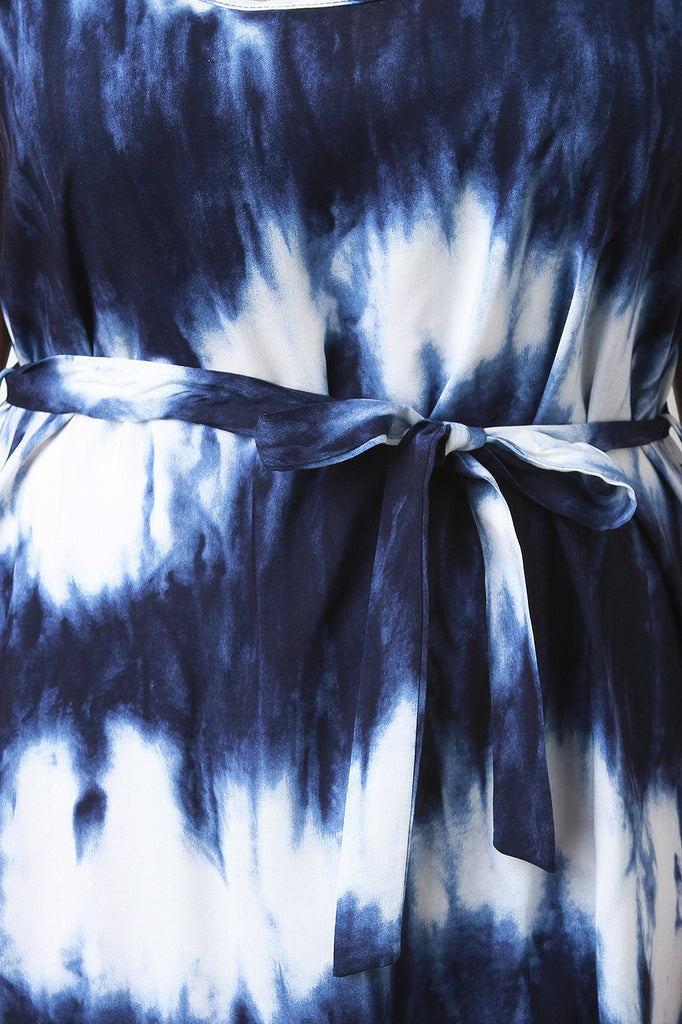 This tie dye effect. Finished with a self tie waist sash. Accessories sold separately. 100% Rayon.