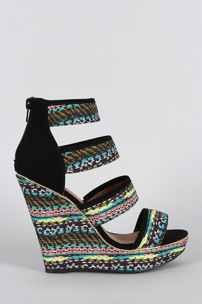 Qupid Abstract Print Strappy Caged Open Toe Platform Wedge